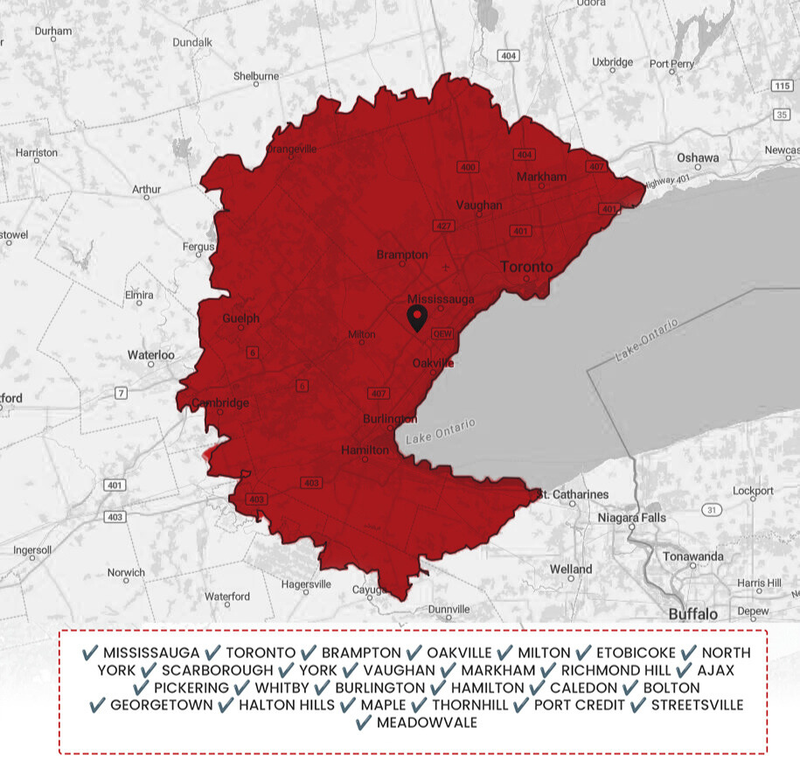 ✔️ Mississauga ✔️ Toronto ✔️ Brampton ✔️ Oakville ✔️ Milton ✔️ Etobicoke ✔️ North York ✔️ Scarborough ✔️ York ✔️ Vaughan ✔️ Markham ✔️ Richmond Hill ✔️ Ajax ✔️ Pickering ✔️ Whitby ✔️ Burlington ✔️ Hamilton ✔️ Caledon ✔️ Bolton ✔️ Georgetown ✔️ Halton Hills ✔️ Maple ✔️ Thornhill ✔️ Port Credit ✔️ Streetsville ✔️ Meadowvale